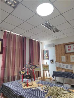 端村学校芦苇工艺教室,学生在上课制作工艺品过程中,用眼长期高度集中,为避免学生视觉疲劳,保护视网膜,避免近视,通过安装无电照明系统,把太阳光、自然光直接引到教室,使教室内光线达到全光谱、无频闪、显色指数97以上,可避免作品产生色差,为学生营造无以伦比的光照环境。