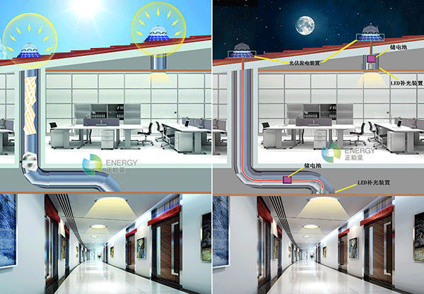 正能量科技导光管照明系统是通过室外采光装置高效收集自然光,并由导光管将光反射后传输至漫射器,由漫射透镜对阳光进行打散让光线变的柔和、均匀照射到室内各个角落。晚上利用光伏发电装置白天所发的电带动无电照明系统里加装的LED补光??榻姓彰?,实现24小时无电照明。